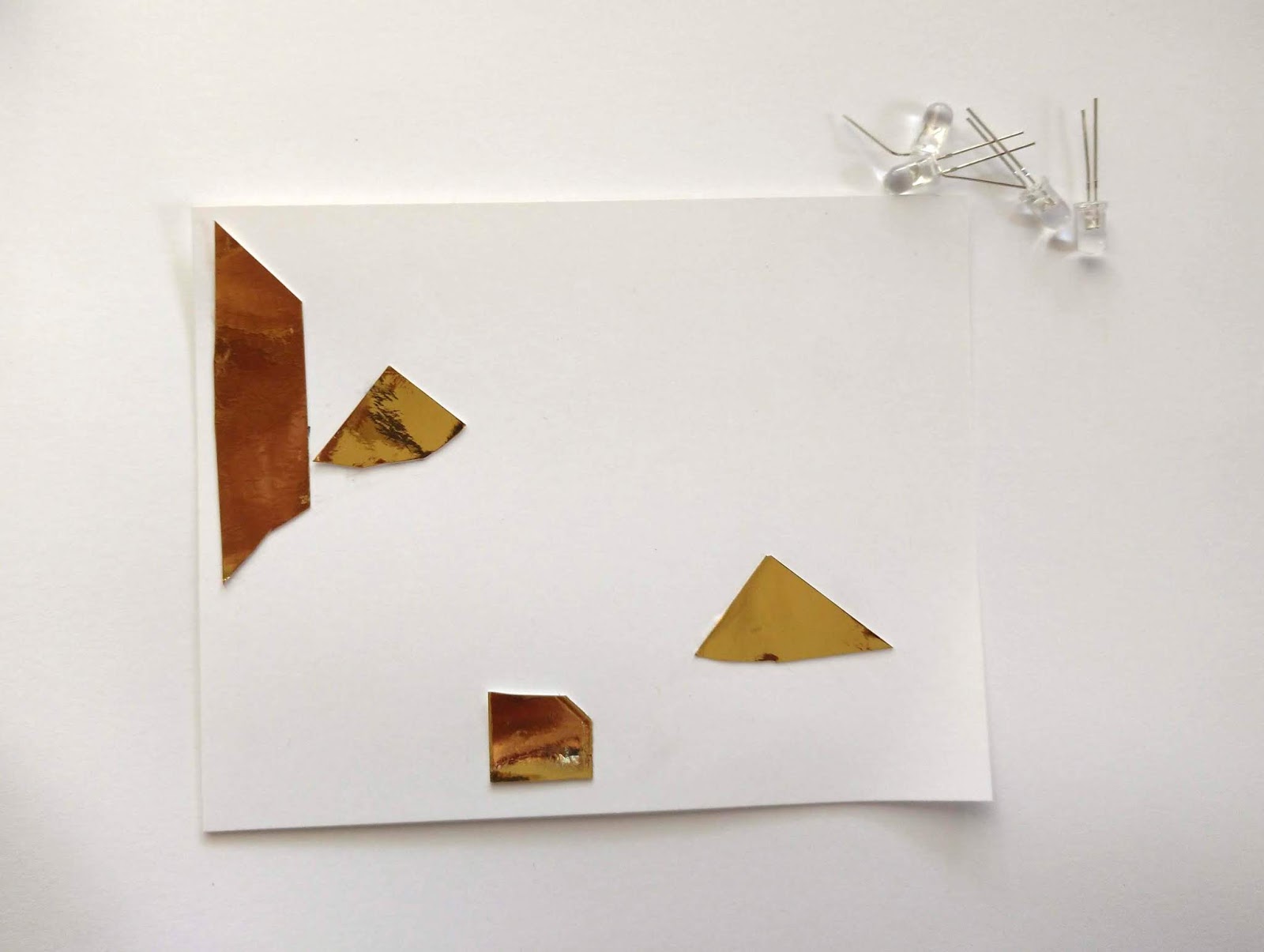 independent input-ouput line and 2. positive leg of the diode should be connected to positive side of the battery. Follow this strictly and the diode will light up. Make sure the diodes' legs are touching the copper tape paths, press them and tape them with the same coper foil tape to the circuit path. Due to size of the diodes (5mm), I had to place two layers of foam tapes on the sides and all round the diodes so that card front is well supported. Circuits are planned in a way that all the + meet at the corner of the cardstock which can then be folded over the battery (+) and all (-) meet farther in from the corner under the (-) side of the battery. Circuits will complete when the corner is pressed over the battery, same point will be marked on the complete card panel with a little diecut heart shape.